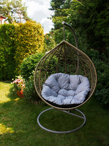 Poducha ogrodowa marki Blomster jest idealnie przystosowana do umieszczenia na wiszącej huśtawce ogrodowej, okrągłym stojącym fotelu lub tak zwanej huśtawce bocianie gniazdo.